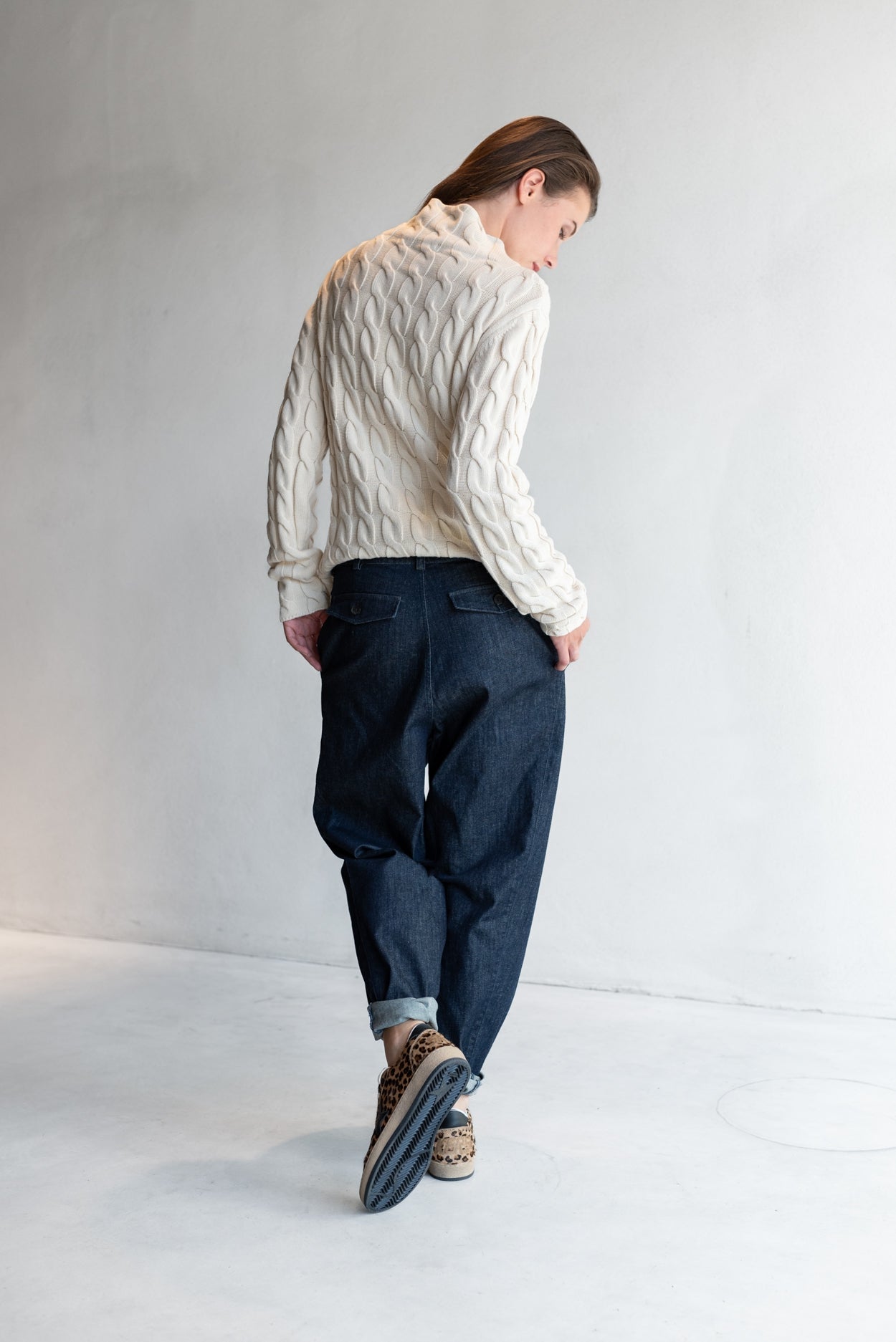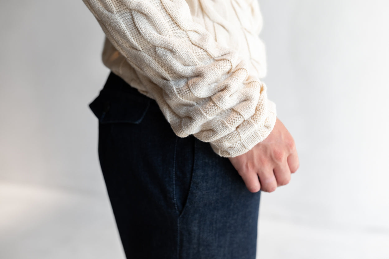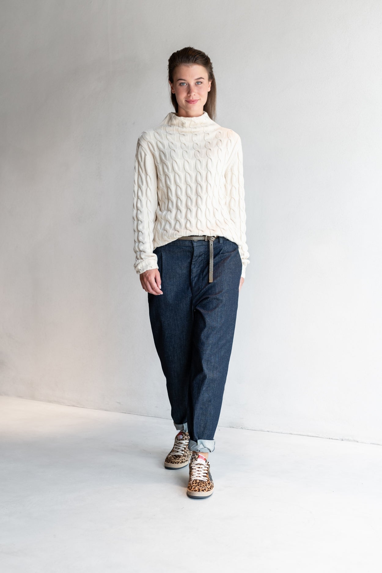 Deze aangesloten trui is gebreid van een zachte cotton/modal blend en heeft een sierlijk gevlochten breipatroon dat structuur en elegantie toevoegt. De kleine colkraag en het flatterende silhouet maken Feline tot een tijdloos stuk dat moeiteloos meebeweegt met jouw stijll.
